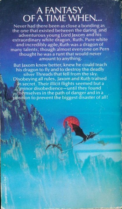 A fantasy of a time when...Never had there been as close a bonding as the one that existed between the daring and adventurous young Lord Jaxom and his extraordinary white dragon, Ruth. Pure white and incredibly agile, Ruth was a dragon of many talents, though almost everyone on Pern thought he was a runt that would never amount to anything.But Jaxom knew better, knew he could teach his dragon to fly and to destroy the deadly silver Threads that fell from the sky. Disobeying all rules, Jaxom and Ruth trained in secret. Their illicit flights seemed but a minor disobedience -- until they found themselves in the path of danger and in a position to prevent the biggest disaster of all!
