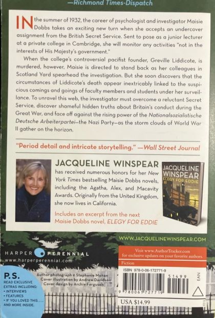 In the summer of 1932, the career of psychologist and investigator Maisie Dobbs takes an exciting new turn when she accepts an undercover assignment from the British Secret Service. Sent to pose as a junior lecturer at a private college in Cambridge, she will monitor any activities “not in the interests of His Majesty’s government.” When the college’s controversial pacifist founder, Greville Liddicote, is murdered, however, Maisie is directed to stand back as her colleagues in Scotland Yard spearhead the investigation. But she soon discovers that the circumstances of Liddicote’s death appear inextricably linked to the suspicious comings and goings of faculty members and students under her surveillance. To unravel this web, the investigator must overcome a reluctant Secret Service, discover shameful hidden truths about Britain’s conduct during the Great War, and face off against the rising power of the Nationalsozialistische Deutsche Arbeiterpartei—the Nazi Party—as the storm clouds of World War II gather on the horizon.