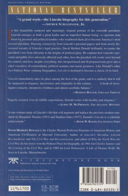 A masterful work by Pulitzer Prize–winning author David Herbert Donald, Lincoln is a stunning portrait of Abraham Lincoln’s life and presidency.Donald brilliantly depicts Lincoln’s gradual ascent from humble beginnings in rural Kentucky to the ever-expanding political circles in Illinois, and finally to the presidency of a country divided by civil war. Donald goes beyond biography, illuminating the gradual development of Lincoln’s character, chronicling his tremendous capacity for evolution and growth, thus illustrating what made it possible for a man so inexperienced and so unprepared for the presidency to become a great moral leader. In the most troubled of times, here was a man who led the country out of slavery and preserved a shattered Union—in short, one of the greatest presidents this country has ever seen.