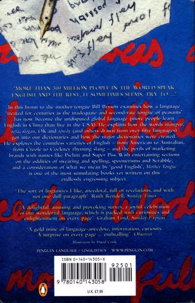How did English, 'treated for centuries as the inadequate and second-rate tongue of peasants' become the undisputed global language? How did words like shampoo, sofa and rowdy (and others drawn from over fifty languages) find their way into our dictionary? In this revealing and often hilarious book, Bill Bryson examines the mother tongue and explores the countless varieties of English and the perils of marketing brands with names like Pschitt and Super Piss. With entertaining sections on the oddities of swearing and spelling, spoonerisms and Scrabble, and a consideration of what we mean by 'good English', "Mother Tongue" is one of the most stimulating books yet written on this endlessly engrossing subject.