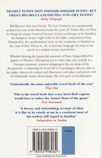 Bill Brysonâe(tm)s first travel book, The Lost Continent, was unanimously acclaimed as one of the funniest books in years. In Neither Here nor There he brings his unique brand of humour to bear on Europe as he shoulders his backpack, keeps a tight hold on his wallet, and journeys from Hammerfest, the northernmost town on the continent, to Istanbul on the cusp of Asia. Fluent in, oh, at least one language, he retraces his travels as a student twenty years before. Whether braving the homicidal motorists of Paris, being robbed by gypsies in Florence, attempting not to order tripe and eyeballs in a German restaurant or window-shopping in the sex shops of the Reeperbahn, Bryson takes in the sights, dissects the culture and illuminates each place and person with his hilariously caustic observations. He even goes to Liechtenstein.