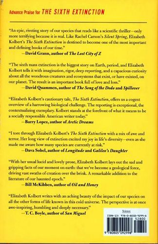 WINNER OF THE PULITZER PRIZEONE OF THE NEW YORK TIMES BOOK REVIEW'S 10 BEST BOOKS OF THE YEARA NEW YORK TIMES BESTSELLERA NATIONAL BOOK CRITICS CIRCLE AWARD FINALISTA major book about the future of the world, blending intellectual and natural history and field reporting into a powerful account of the mass extinction unfolding before our eyesOver the last half a billion years, there have been five mass extinctions, when the diversity of life on earth suddenly and dramatically contracted. Scientists around the world are currently monitoring the sixth extinction, predicted to be the most devastating extinction event since the asteroid impact that wiped out the dinosaurs. This time around, the cataclysm is us. In The Sixth Extinction, two-time winner of the National Magazine Award and New Yorker writer Elizabeth Kolbert draws on the work of scores of researchers in half a dozen disciplines, accompanying many of them into the field: geologists who study deep ocean cores, botanists who follow the tree line as it climbs up the Andes, marine biologists who dive off the Great Barrier Reef. She introduces us to a dozen species, some already gone, others facing extinction, including the Panamian golden frog, staghorn coral, the great auk, and the Sumatran rhino. Through these stories, Kolbert provides a moving account of the disappearances occurring all around us and traces the evolution of extinction as concept, from its first articulation by Georges Cuvier in revolutionary Paris up through the present day. The sixth extinction is likely to be mankind's most lasting legacy; as Kolbert observes, it compels us to rethink the fundamental question of what it means to be human.