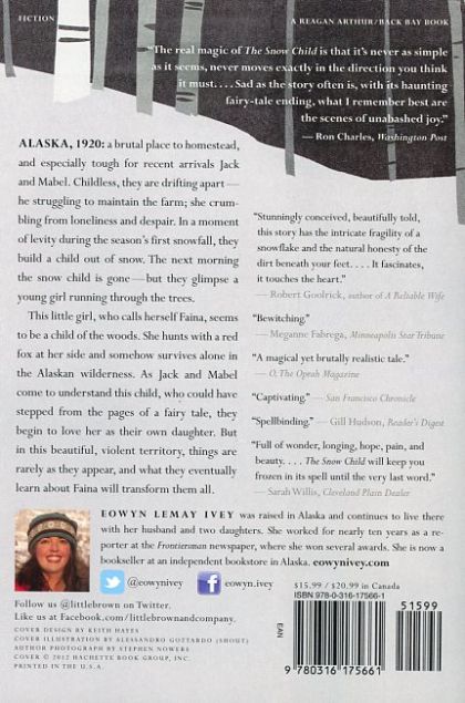 In this magical debut, a couple's lives are changed forever by the arrival of a little girl, wild and secretive, on their snowy doorstep Alaska, 1920: a brutal place to homestead, and especially tough for recent arrivals Jack and Mabel. Childless, they are drifting apart--he breaking under the weight of the work of the farm; she crumbling from loneliness and despair. In a moment of levity during the season's first snowfall, they build a child out of snow. The next morning the snow child is gone--but they glimpse a young, blonde-haired girl running through the trees. This little girl, who calls herself Faina, seems to be a child of the woods. She hunts with a red fox at her side, skims lightly across the snow, and somehow survives alone in the Alaskan wilderness. As Jack and Mabel struggle to understand this child who could have stepped from the pages of a fairy tale, they come to love her as their own daughter. But in this beautiful, violent place things are rarely as they appear, and what they eventually learn about Faina will transform all of them.