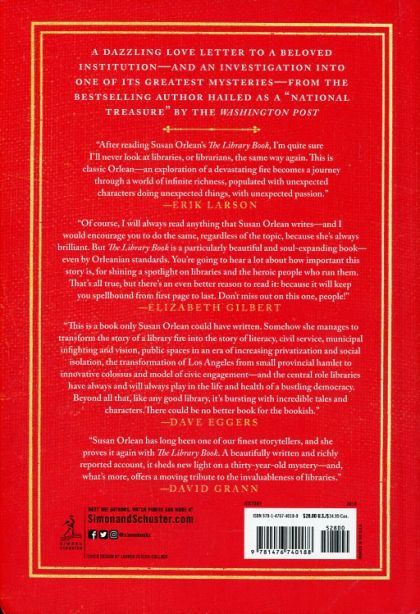 A REESE WITHERSPOON x HELLO SUNSHINE BOOK CLUB PICK A WASHINGTON POST TOP 10 BOOK OF THE YEAR * A NEW YORK TIMES BESTSELLER and NEW YORK TIMES NOTABLE BOOK OF 2018 “A constant pleasure to read…Everybody who loves books should check out The Library Book.” —The Washington Post “CAPTIVATING…DELIGHTFUL.” —Christian Science Monitor * “EXQUISITELY WRITTEN, CONSISTENTLY ENTERTAINING.” —The New York Times * “MESMERIZING…RIVETING.” —Booklist (starred review) A dazzling love letter to a beloved institution—and an investigation into one of its greatest mysteries—from the bestselling author hailed as a “national treasure” by The Washington Post.On the morning of April 29, 1986, a fire alarm sounded in the Los Angeles Public Library. As the moments passed, the patrons and staff who had been cleared out of the building realized this was not the usual fire alarm. As one fireman recounted, “Once that first stack got going, it was ‘Goodbye, Charlie.’” The fire was disastrous: it reached 2000 degrees and burned for more than seven hours. By the time it was extinguished, it had consumed four hundred thousand books and damaged seven hundred thousand more. Investigators descended on the scene, but more than thirty years later, the mystery remains: Did someone purposefully set fire to the library—and if so, who? Weaving her lifelong love of books and reading into an investigation of the fire, award-winning New Yorker reporter and New York Times bestselling author Susan Orlean delivers a mesmerizing and uniquely compelling book that manages to tell the broader story of libraries and librarians in a way that has never been done before. In The Library Book, Orlean chronicles the LAPL fire and its aftermath to showcase the larger, crucial role that libraries play in our lives; delves into the evolution of libraries across the country and around the world, from their humble beginnings as a metropolitan charitable initiative to their current status as a cornerstone of national identity; brings each department of the library to vivid life through on-the-ground reporting; studies arson and attempts to burn a copy of a book herself; reflects on her own experiences in libraries; and reexamines the case of Harry Peak, the blond-haired actor long suspected of setting fire to the LAPL more than thirty years ago. Along the way, Orlean introduces us to an unforgettable cast of characters from libraries past and present—from Mary Foy, who in 1880 at eighteen years old was named the head of the Los Angeles Public Library at a time when men still dominated the role, to Dr. C.J.K. Jones, a pastor, citrus farmer, and polymath known as “The Human Encyclopedia” who roamed the library dispensing information; from Charles Lummis, a wildly eccentric journalist and adventurer who was determined to make the L.A. library one of the best in the world, to the current staff, who do heroic work every day to ensure that their institution remains a vital part of the city it serves. Brimming with her signature wit, insight, compassion, and talent for deep research, The Library Book is Susan Orlean’s thrilling journey through the stacks that reveals how these beloved institutions provide much more than just books—and why they remain an essential part of the heart, mind, and soul of our country. It is also a master journalist’s reminder that, perhaps especially in the digital era, they are more necessary than ever.
