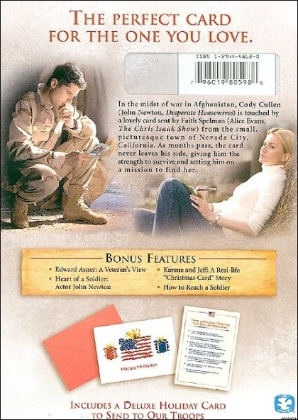 US Army sergeant Cody Cullen's horror tour in Afghanistan ends when his mate Jonesy is blown to pieces while they deliver medical supplies in Nurestan. Cody is sent home to return private possessions to Jonesy's bride turned widow. On his way home he passes Nevada City, California, where he meets Faith Spelman, who writes the parish's Christmas cards to lonely soldiers, coincidentally including him, an orphan. He happens to save her dad Luke from a serious car run-over. The Spellmans invite Cody home for dinner, then the Christmas tide. He proves a great help in the family logging firm. Vietenam vet Luke wants Cody as son-in-law, but although charmed, Faith still seems committed to rarely present fiancé Paul, a wine broker.