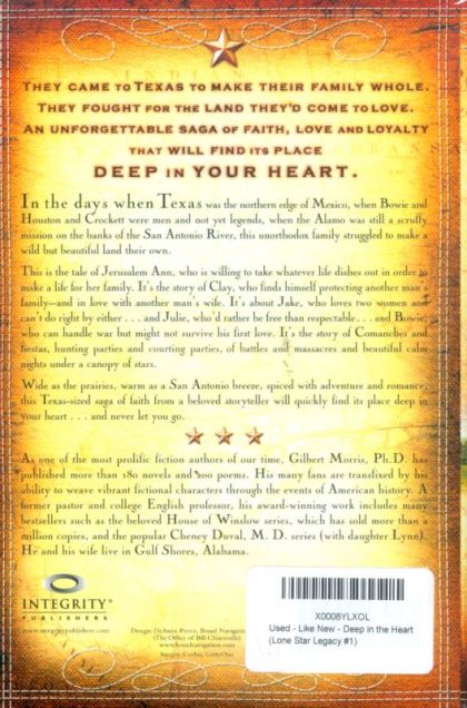 The Alamo has fallen. The fate of Texas is uncertain. And the strength of one woman's faith is hanging in the balance. Her husband is dead, a casualty of the Alamo. Her son and the man she's learning to love just narrowly escaped death themselves at the confrontation at Goliad. Now Mexico's armies are pushing north, burning property and killing settlers, while Comanche raiders terrorize ranchers along the Brazos where Jerusalem Ann Hardin has decided to plant her clan. Will she join the panicked settlers fleeing to safety, or will she stand and fight for this land she loves? Will her new faith remain strong when the Comanche raids get personal? Will she choose the right man to marry when two suitors come calling? Jerusalem Ann's thrilling tale whisks us through a kaleidoscope of exciting scenes, from the blood-soaked battlefield at San Jacinto to dusty cattle drives across open range; from the hidden village of a Comanche war chief to angry brawls in a frontier saloon. Spiced with humor, and brimful of romance and adventure, this saga of faith on the American frontier will have you holding your breath as you follow the trials and triumphs of some of Texas' finest in Book Two of the Lone Star Legacy. - Back cover.