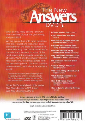 We live in a culture with more questions than ever—questions that affect one’s acceptance of the Bible as authoritative and trustworthy. This DVD features easy-to-understand answers to some of the most-important apologetics quandaries of today. You’ll love these highly stylized mini-interviews, featuring best-selling authors such as Ken Ham, Dr. Terry Mortenson, Carl Kerby, Dr. David Menton, and others. It contains twelve answers, each about 4-minutes in length. Approx. 43 minutes.