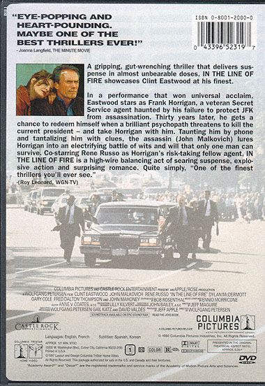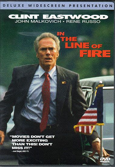 Clint Eastwood delivers one of his finest performances, as a secret service agent haunted by his past in Wolfgang Petersen's taut thriller In the Line of Fire. Eastwood plays Frank Horrigan, a secret service agent who keeps thinking back to November 22, 1963, when, as an agent hand-picked by President Kennedy, he became one of the few agents to have lost a president to an assassin. Decades later, psychotic Mitch Leary (John Malkovich) is stalking another president (Jim Curley) running for re-election. He has spent long hours studying the psyche of Frank Horrigan, and he taunts Horrigan (feeling that there is a bond between them), telling him of his plans to kill the president. After his conversation with Leary, Horrigan makes sure he is assigned to presidential protection duty. Horrigan has no intention of failing his president this time around, and he is more than willing to take a bullet. But everything goes Leary's way — he is smart and cagey and the president's aides refuse to alter the itinerary. As the election draws closer, Horrigan's chances to catch Leary look to be less and less a possibility, and he begins to doubt his own abilities — both now and in the past, when Kennedy was murdered. — Paul Brenner