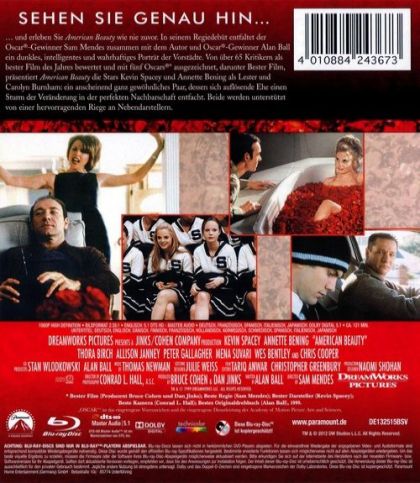 Noted theater director Sam Mendes , who was responsible for the acclaimed 1998 revival of Cabaret and Nicole Kidman 's turn in The Blue Room , made his motion picture debut with this film about the dark side of an American family, and about the nature and price of beauty in a culture obsessed with outward appearances. Kevin Spacey plays Lester Burnham, a man in his mid-40s going through an intense midlife crisis; he's grown cynical and is convinced that he has no reason to go on. Lester's relationship with his wife Carolyn ( Annette Bening ) is not a warm one; while on the surface Carolyn strives to present the image that she's in full control of her life, inside she feels empty and desperate. Their teenage daughter Jane ( Thora Birch ) is constantly depressed, lacking in self-esteem, and convinced that she's unattractive. Her problems aren't helped by her best friend Angela ( Mena Suvari ), an aspiring model who is quite beautiful and believes that that alone makes her a worthwhile person. Jane isn't the only one who has noticed that Angela is attractive: Lester has fallen into uncontrollable lust for her, and she becomes part of his drastic plan to change his body and change his life. Meanwhile, next door, Colonel Fitts ( Chris Cooper ) has spent a lifetime in the Marine Corps and can understand and tolerate no other way of life, which makes life difficult for his son Ricky ( Wes Bentley ), an aspiring filmmaker and part-time drug dealer who is obsessed with beauty, wherever and whatever it may be. American Beauty was also the screen debut for screenwriter Alan Ball . — Mark Deming
