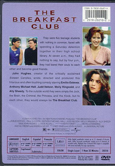 John Hughes wrote and directed this quintessential 1980s high school drama featuring the hottest young stars of the decade. Trapped in a day-long Saturday detention in a prison-like school library are Claire, the princess ( Molly Ringwald ); Andrew, the jock ( Emilio Estevez ); John, the criminal ( Judd Nelson ); Brian, the brain ( Anthony Michael Hall ); and Allison, the basket case ( Ally Sheedy ). These five strangers begin the day with nothing in common, each bound to his/her place in the high school caste system. Yet the students bond together when faced with the villainous principal ( Paul Gleason ), and they realize that they have more in common than they may think, including a contempt for adult society. "When you grow up, your heart dies," Allison proclaims in one of the film's many scenes of soul-searching, and, judging from the adults depicted in the film, the teen audience may very well agree. Released in a decade overflowing with derivative teen films, The Breakfast Club has developed an almost cult-like status, and it has become a classic of the genre thanks to its band of talented stars and attempt to examine the stereotypes found in American high schools. — Dylan Wilcox
