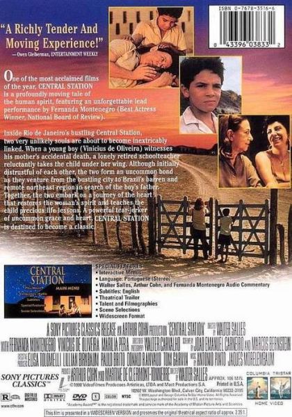Former documentary filmmaker Walter Salles ( Foreign Land ) directed this Brazilian-French road movie tracing the travels and travails of a young boy and an aging woman across the Brazilian landscape. In Rio de Janeiro's central railroad station, callous Dora (leading Brazilian stage/screen actress Fernanda Montenegro ) works at a stand where she writes letters for a parade of poor and illiterate. Some of these remain undelivered because she chooses not to mail all of the letters. One of her customers is a woman whose nine-year-old son, Josue ( Vinicius de Oliveira ), hopes to see the father he has never met, but after the mother dictates two letters to the father, she's killed when hit by a bus. Since Josue is left homeless, Dora reluctantly takes him home to her small apartment overlooking the railroad tracks, where she sometimes spends time with her neighbor Irene ( Marilia Pera ). Dora places Josue with people who claim to find adoptive parents. When Irene informs her they actually sell children who are then killed for their organs, Dora rescues Josue, and the two board a bus. After a failed attempt to abandon Josue at a roadside stop, Dora and Josue hitch a ride from a religious truck driver. Failing to locate his father, they arrive penniless at a huge rural religious convocation, where Josue suggests Dora bring her letter-writing skills back into play. The notion works, and Dora profits by writing letters to saints for the more devout among the assembled multitudes. Continuing on, they arrive at a sprawling-mass housing development — and hopefully, a solution to the problem of a family for Josue. Young actor de Oliveira was a shoeshine boy who beat out more than 1,500 other children who auditioned or were interviewed for the Josue role. Made with grants from the Sundance Institute, NHK, and the French Ministry of Culture, this film was shown at 1998 film festivals (Sundance, Berlin). — Bhob Stewart