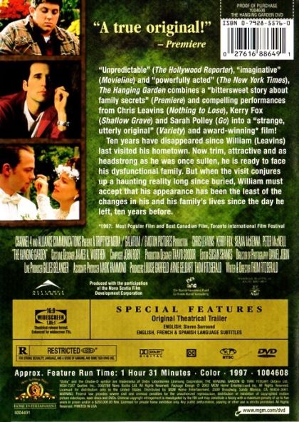 Ten years after he disappeared from his family's life, Sweet William ( Chris Leavins ) returns home to Nova Scotia for his sister's wedding. Despite the fact that he's gone from a morbidly obese adolescent to a thin, handsome, self-assured young man, the reunion proves bittersweet. Although he reconnects with his loving sister Rosemary ( Kerry Fox ) and his Alzheimer's-afflicted grandmother Grace ( Joan Orenstein ), he is dismayed to learn that his parents' rocky marriage has settled into permanent animosity. He also witnesses the toll his absence has taken on his abusive, alcoholic father, Whiskey Mack ( Peter MacNeill ); his tight-lipped mother Iris ( Seana McKenna ); and Violet ( Christine Dunsworth ), the tomboyish younger sister he's never met. The past lingers in the very air of William's childhood home; disturbing visions of himself as both a waifish boy ( Ian Parsons ) and a fat adolescent ( Troy Veinotte ) follow him everywhere. And it's not just the ghosts who dredge up the past. Rosemary's new husband, Fletcher ( Joel S. Keller ), flirts shamelessly with William, bringing back memories of the painful relationship the two shared as teenagers. When Iris disappears, William must confront not only the haunting visions of his past, but also the unfinished business he left behind. The feature debut of writer/director Thom Fitzgerald , The Hanging Garden was the winner of the Air Canada People's Choice Award for best picture and the co-winner of the Toronto-CITY TV Award for Best Canadian Film at the Toronto International Film Festival . — Brian J. Dillard