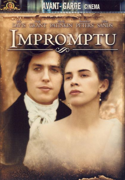 Amandine Aurore Lucie Dupin, better known in the literary world as George Sand, not only took a man's name, but trotted around wearing pants and smoking cigars in public. No great shakes today, but in the 1800s she was perhaps the most famous (or infamous) woman in the world. One of the first original celebrities, aside from her garb and literary output, she was known to inspire many duels and broken hearts among other famous hedonist artists. One character describes her in Impromptu , as "that graveyard." The film engages in a sexual roundelay among Sand's ( Judy Davis ) many friends — Eugene Delacroix ( Ralph Brown ), Alfred DeMusset ( Mandy Patinkin ), Franz Liszt ( Julian Sands ), and Frederick Chopin ( Hugh Grant ). The entire crew heads off to the summer estate of the Duke and Duchess d'Antan ( Anton Rodgers and Emma Thompson ), invited there by the culture-vulture hosts. Sand takes a bead on the sickly Chopin and spends her time throwing herself at him. Also on hand is Liszt 's mistress Marie d'Agoult ( Bernadette Peters ) and Felicien Mallefille ( Georges Corraface ), Sand's recently jilted lover. Mallefille is jealous of any of the other guests who glance in Sand's direction and continually challenges them to duels. Marie, on the other hand, is enlisted by Sand to deliver a note to Chopin . But Marie, jealous of Sand, delivers the note substituting her name for Sand's. And as the weekend continues, the sexual merry-go-round continues at full tilt. — Paul Brenner