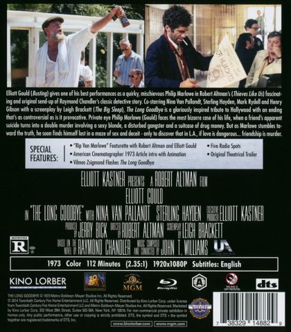 "It's OK with me...." Applying his deconstructive eye to the "film noir" tradition, Robert Altman updated Raymond Chandler in his 1973 version of Chandler's novel, The Long Goodbye . Smart-aleck, cat-loving private eye Philip Marlowe ( Elliott Gould ) is certain that his friend Terry Lennox ( Jim Bouton ) isn't a wife-killer, even after the cops throw Marlowe in jail for not cooperating with their investigation into Lennox's subsequent disappearance. Once he gets out of jail, Marlowe starts to conduct his own search when he discovers that mysterious blonde Eileen Wade ( Nina Van Pallandt ), who hired him to find her alcoholic novelist husband Roger ( Sterling Hayden ), lives on the same Malibu street as the absent Lennox and his deceased spouse. As numerous variations on the title song play in unexpected places, Marlowe encounters a shady doctor, a bottle-wielding gangster (director Mark Rydell ), and a guard aping Barbara Stanwyck (among other stars), before heading to Mexico to stumble on the truth once and for all. — Lucia Bozzola