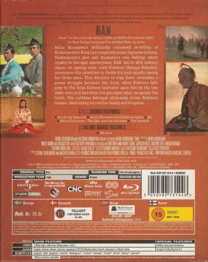 Ran is Japanese filmmaker Akira Kurosawa 's reinterpretation of William Shakespeare's King Lear . The Lear counterpart is an elderly 16th-century warlord ( Tatsuya Nakadai ), who announces that he's about to divide his kingdom equally among his three sons. In his dotage, he falls prey to the false flattery of his treacherous sons ( Akira Terao and Jinpachi Nezu ), while banishing his youngest son ( Daisuke Ryu ), the only member of the family who loves him enough to tell him the unvarnished truth. Thanks to his foolish pride, his domain collapses under its own weight as the sons battle each other over total control. Kurosawa 's first film in five years, Ran had been in the planning stages for twice that long; Kurosawa had storyboarded the project with a series of vivid color paintings that have since been published in book form in England. The battle scenes are staged with such brutal vigor that it's hard to imagine that the director was 75 years old at the time. This 160-minute historical epic won several international awards, but it was not a hit in Japan, and it would be five more years before Kurosawa would be able to finance another picture. — Hal Erickson