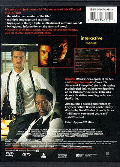 Director David Fincher 's dark, stylish thriller ranks as one of the decade's most influential box-office successes. Set in a hellish vision of New York, where it is always raining and the air crackles with impending death, the film concerns Det. William Somerset ( Morgan Freeman ), a homicide specialist just one week from a well-deserved retirement. Every minute of his 32 years on the job is evident in Somerset's worn, exhausted face, and his soul aches with the pain which can only come from having seen and felt far too much. But Somerset's retirement must wait for one last case, for which he is teamed with young hotshot David Mills ( Brad Pitt ), the fiery detective set to replace him at the end of the week. Mills has talked his reluctant wife Tracy ( Gwyneth Paltrow ) into moving into the big city so that he could tackle important cases, but his first and Somerset's last are more than either man has bargained for. A diabolical serial killer is staging grisly murders, choosing victims representing the seven deadly sins. First, an obese man is forced to eat until his stomach ruptures to represent Gluttony, then a wealthy defense lawyer is made to cut off a pound of his own flesh as penance for Greed. Somerset initially refuses to take the case, realizing that there will be five more murders, ghastly sermons about Lust, Sloth, Pride, Wrath, and Envy presented by a madman to a sinful world. Somerset is correct, and something within him cannot let the case go, forcing the weary detective to team with Mills and see the case to its almost unspeakably horrible conclusion. The moody photography is by Darius Khondji ; the nauseatingly vivid special effects are by makeup artist Rob Bottin , best known for more fantasy-oriented work in films like The Howling (1981). — Robert Firsching