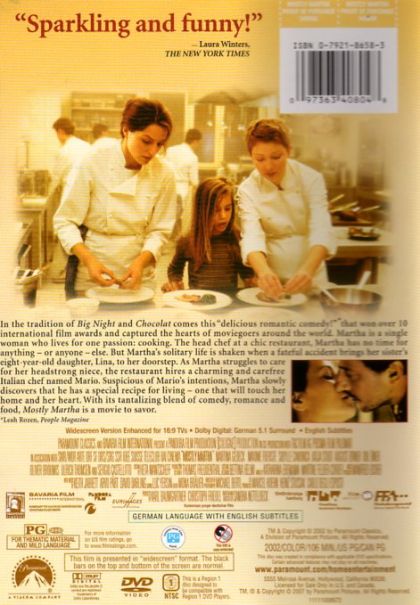 Sandra Nettelbeck spins this gentle drama about how a child's presence can change the lives of the most shy and career-minded of adults. Martha ( Martina Gedeck ) is the chef of a popular Hamburg eatery who fusses and obsesses over each dish before it leaves the kitchen. The demands of her job and her natural shyness keep her from breaking out of her routine to meet new people. When her sister suddenly dies in a car accident, Martha adopts Lina, her eight-year-old niece. Martha's life soon completely changes — not only must she adjust herself to new parental role, but she must help Lina deal with her grief over the loss of her mother. Martha gets unexpected help from Mario, Martha's hunky new sous chef, who is not only a whiz on the chopping block but knows sundry magic tricks and jokes to keep Lina's spirits afloat. Just as Martha starts to grow attached to the girl, Lina's erratic father shows up demanding that he take her back to Italy with him. This film was screened at the 2001 Toronto Film Festival . — Jonathan Crow