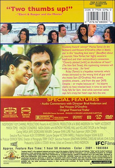 Is Ruby Weaver's Mr. Right really an emissary from the year 2,470, or is he just a complete loon ball? This question is at the heart of Brad Anderson 's whimsical romantic comedy. The story opens with Ruby ( Marisa Tomei ) lamenting over her boyfriend Sam ( Vincent D'Onofrio ) to her shrink ( Holland Taylor ). In a series of flashbacks, the film quickly sketches Ruby as a neurotic with an unhappy track record concerning men and Sam as an oddball who is afraid of small dogs and has a barcode tattooed to his arm. But he's nuts over Ruby, and at least initially, that is enough for her. Slowly, Sam begins to reveal his "past." He tells her that he is from the Dubuque of the future and that he hails from a rare "anachronistic" family who believe that reproduction should occur the old-fashioned, fun way as opposed to the more popular cloning method. At first, Ruby is amused, until she realizes that he's not kidding. After a series of arguments, he agrees to visit Ruby's analyst, which yields unexpected results. This film premiered at the 2000 Sundance Film Festival. — Jonathan Crow