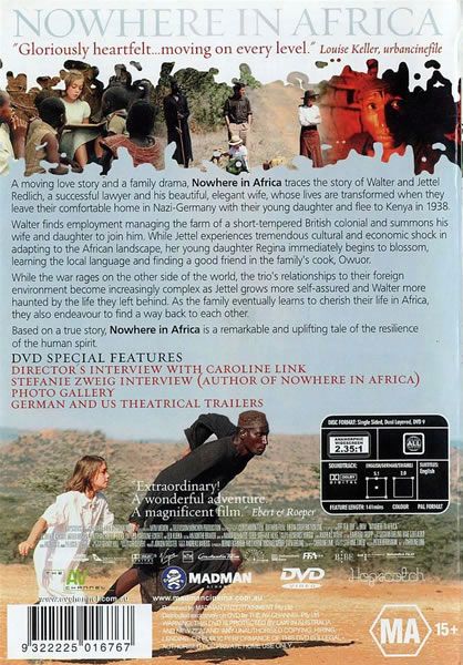 A family on the run for their lives finds themselves in a beautiful but utterly unfamiliar world in this drama based on the autobiographical novel by Stefanie Zweig. Walter Redlich (Merab Ninidze) is a successful Jewish lawyer living in Germany during the rise of the Third Reich. Aware of the increasing dangers of remaining in Germany, Walter seeks exile on a farm in Kenya, while his socially prominent wife, Jettel (Juliane Koehler), and his young daughter, Regina (Lea Kurka), stay behind, as does his father, Max (Gerd Heinz), and Jettel's sister, Kaethe (Regine Zimmermann). In time, as the pogroms against the Jews increase in Germany, Jettel and Regina join Walter in Kenya, but the transition is not easy for Walter, who is still learning the nuts and bolts of running the farm (and discovers that Germans are not welcomed by the British settlers in Kenya), or Jettel, who is not accustomed to physical labor and resents having to help with the farming. While Regina at first finds her new surroundings alienating and unfamiliar, she soon becomes fascinated with the rugged beauty of Kenya and becomes fast friends with Owour (Sidede Onyulo), who serves as the family's cook. In time, Germany invades Africa, and Walter finds himself in a British internment camp; Jettel and Regina also are captured, but Jettel uses her sexual allure to persuade a British officer to arrange for Walter to be put in charge of another farm, and Regina is sent to a boarding school for girls. After the war, the Redlichs must decide whether to remain in Kenya or to return to the country that would have persecuted them. — Mark Deming