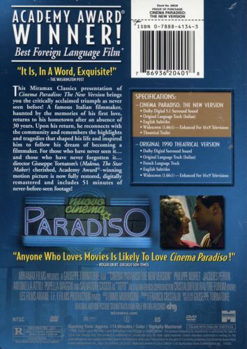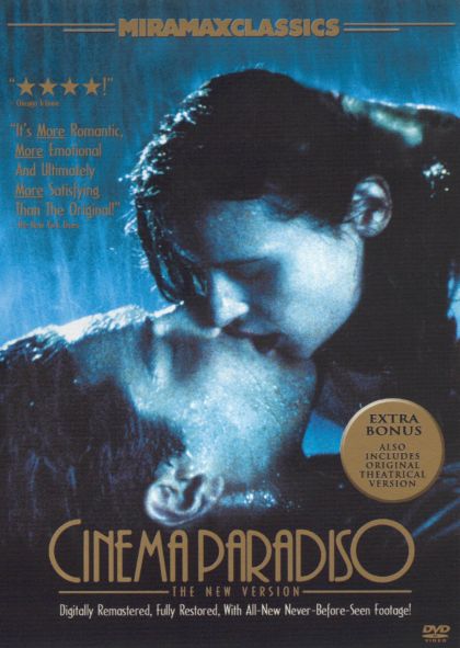 Cinema Paradiso offers a nostalgic look at films and the affect they have on a young boy who grows up in and around the title village movie theater in this Italian comedy drama that is based on the life and times of screenwriter/director Giuseppe Tornatore . The story begins in the present as a Sicilian mother pines for her estranged son, who left many years ago and has since become a prominent Roman film director who has taken the advice of his mentor too literally. He finally returns to his home village to attend the funeral of the town's former film projectionist and, in so doing, embarks upon a journey into his boyhood just after WW II when he became the unofficial son of the town projectionist. In the dark confines of the Cinema Paradiso , the boy and the other townsfolk try to escape from the grim realities of post-war Italy. The town censor is also there to insure nothing untoward appears onscreen, invariably demanding that all kissing scenes be edited out. One day, Salvatore saves the projectionist's life after a fire, and then befriends the new projectionist. A few years later, Salvatore falls in love with a beautiful girl who breaks his heart after he is inducted into the military. Thirty years later, Salvatore has come to say good-bye to his life-long friend, who has left him a little gift in a film can. In 2002, over a decade after the film's original release, Tornatore brought the original 170-minute director's cut to American screens for the first time. — Sandra Brennan