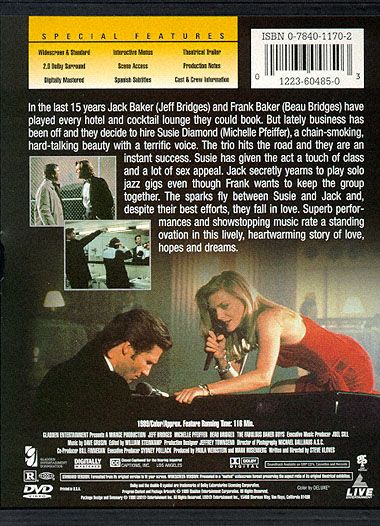 Real-life siblings Beau and Jeff Bridges star as the eponymous Fabulous Baker Boys. Musical prodigies both, the Bakers have long been teamed as a twin-piano act, with the less talented Frank (Beau Bridges) coasting on the skills of his brilliant younger brother Jack (Jeff Bridges). Their career dwindling to nickel-and-dime dates in second-rate clubs, the Bakers decide that they need a female vocalist to boost their popularity. They select auditioner Susie Diamond (Michelle Pfeiffer), who in addition to being a gifted songstress is drop-dead gorgeous. The newly renovated Baker Boys act scores a success, which is inevitably threatened by Susie's growing popularity and by Jack's insistence upon pursuing an affair with the girl. — Hal Erickson