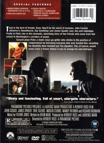 John Cusack and James Spader play against type in Kevin Wade's morality play, directed by Herbert Ross. Spader plays Tim Gerrity, a well-heeled WASP blueblood, who has dedicated his life to justice and public service. Engaged to Diana Stiles (Imogene Stubbs), the daughter of a powerful senator (Richard Widmark), Tim seems to have a rosy future ahead of him. Enter Peter Burton (John Cusack), Peter's working-class roommate at the University of Virginia. Peter, a ravenous and devouring go-getter, is out to climb the political ladder at any cost. He sees Tim and latches onto him. Their friendship blooms at the university and continues afterwards, with the weak-willed Tim constantly deferring to the antagonistic and aggressive Peter. But they finally come to blows on skis when Tim finds out that Peter has bedded Diana, who has decided to drop Tim for his lack of ambition. When Peter blackmails Senator Stiles to secure a House seat, Tim rouses himself from his lethargy to fight Peter politically. — Paul Brenner