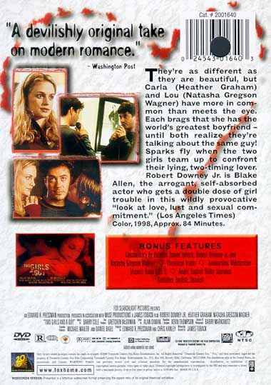 In this darkly comic tale of love and infidelity, Carla (Heather Graham) and Lou (Natasha Gregson Wagner) are both waiting outside an brownstone in Soho and happen to strike up a conversation. It seems both of them are waiting to meet their respective boyfriends, and as they discuss the bright, funny, romantic and monogamous men they've been lucky enough to become involved with, they make a surprising discovery — they're both waiting for the same man, Blake (Robert Downey Jr.), an actor, musician and compulsive womanizer. As they compare notes on the man they've been unknowingly sharing and what they should do about the situation, Blake arrives and quickly starts trying to talk his way out of the disastrous situation. Writer and director James Toback claims he was inspired to write this project for Robert Downey Jr. after seeing a news report showing him in jail after violating parole regarding an arrest for drugs; Two Girls and a Guy was written in four days and shot in eleven days on a single set, and features excellent performances from Downey, Heather Graham, and Natasha Gregson Wagner. — Mark Deming
