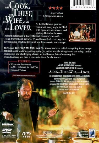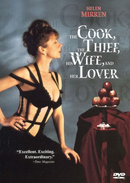 This is probably Peter Greenaway's most famous (or infamous) film, which first shocked audiences at the 1989 Cannes Film Festival and then on both sides of the Atlantic. A gang leader (Michael Gambon), accompanied by his wife (Helen Mirren) and his associates, entertains himself every night in a fancy French restaurant that he has recently bought. Having tired of her sadistic, boorish husband, the wife finds herself a lover (Alan Howard) and makes love to him in the restaurant's coziest places with the silent permission of the cook (Richard Bohringer). Though less cerebral than Greenaway's other films, featuring deadly passions reminiscent of Jacobean revenge tragedies of the early 17th century, the picture still offers the director's usual ironic and paradoxical comments on the relations between eating and sex, love and death. The film is at once funny and horrific, and those who are not used to Greenaway's peculiar style might be even disgusted or shocked; however, one might mention Sacha Vierny's brilliant camerawork, Jean-Paul Gaultier's gaudily stylized costumes, and Michael Nyman's somber, pulsating music, which will haunt the viewer long after the film's end. — Yuri German