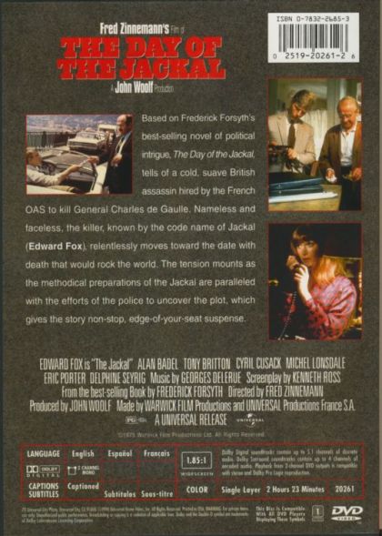 In this involving political thriller, a secret French paramilitary organization plans to assassinate French President Charles De Gaulle (Adrien Cayla-Legrand) because of their disagreement with his policies during the Algerian War. They hire a professional killer, known only as "The Jackal" (Edward Fox). The police learn of the plot from an informer, and police investigator Lebel (Michel Lonsdale) cleverly pieces together the clues to the Jackal's identity. The complicated plot uses parallel editing to cross-cut between the details of the Jackal's preparations for the assassination and Lebel's efforts to find him before it is too late. Fred Zinnemann presents the story, faithfully adapted from the book by Frederick Forsyth, with precise, dramatic flair. Edward Fox is coldly alluring as the Jackal. Well acted and directed, Day of the Jackal is a tense and engrossing political thriller with a surprising ending. — Linda Rasmussen