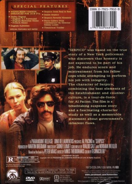 Adapted by Waldo Salt and Norman Wexler from Peter Maas's book, Sidney Lumet's drama portrays the real-life struggle of an honest New York City cop against a corrupt system. Neophyte officer Frank Serpico (Al Pacino) is determined not to let his job get in the way of his individuality. Despite his colleagues' leery reactions, he keeps one foot firmly planted in the counterculture, sporting a beard and love beads and living in bohemian Greenwich Village, while he performs his police duties with dispatch. Serpico's peers genuinely ostracize him, however, when he refuses to take bribes like everybody else. Appalled by the extent of police corruption, Serpico goes to his superiors, but when he discovers that they have ignored his charges, he takes the potentially fatal step of breaking the blue wall of silence and going public with his exposé. Serpico's revelations trigger an independent investigation by the Knapp Commission, but they also make him a marked man, permanently changing his life. Shot on location with a gritty emphasis on documentary-style realism, Serpico presents a city in decay both literally and morally, as everybody is in on the take, and the cops and criminals are almost interchangeable. Released in late 1973, after months of revelations of Presidential malfeasance in the breaking Watergate scandal, Serpico's true story of bureaucratic depravity touched a cultural nerve, and the film became a hit with both critics and audiences, particularly for Pacino's complex performance as the honest, long-haired whistle-blower. One year after his star-making triumph in The Godfather, Pacino was nominated for an Oscar again, and lost again; Lumet and Pacino would reunite two years later for another true New York story, Dog Day Afternoon. — Lucia Bozzola