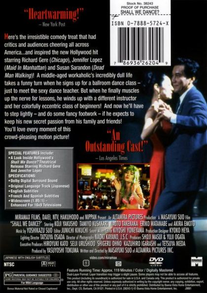 Reminiscent of the Australian hit Strictly Ballroom (1992), this romantic comedy from Japan was a hit in its country of origin, despite (or perhaps because of) its tacit criticisms of the restrictive aspects of Japanese culture. Shohei Sugiyama (Koji Yakusho) is a typically strait-laced Japanese businessmen who, passing by in his commuter train one day, glimpses a beautiful young woman, Mai (real-life ballerina Tamiyo Kusakari) through the window of a dance school. Obsessed with her, Shohei enrolls in the school and meets instructor Mai, who at first mistakes Shohei for a philanderer. To her surprise, however, Shohei is a naturally gifted dancer interested in an artistic partnership only, and Mai begins training with him for a competition. Meanwhile, Shohei becomes familiar with his eccentric fellow students, including one person that Shohei already knows, a co-worker (Akira Emoto) who blooms in the dance sessions as a bewigged master of rumba. As dancing is frowned upon in Japan as a frivolous enterprise for a respectable businessman, Shohei keeps his sideline hobby secret, leading his wife to believe that he's being unfaithful and to hire a private investigator to follow him. — Karl Williams