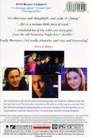 Two men look for a wife — just one will do, thank you — in this offbeat comedy. Jake (Tim Blake Nelson) and Josh (David Arquette) are two brothers who live and work in a vegetable farm somewhere in the Midwest, where they're looked after by their Ma (Lois Smith), who cooks, cleans, and keeps the guys company. When Ma dies, Jake and Josh find they're a bit lonely all by their lonesome, and more importantly, they're not much good at everyday domestic activities, so they decide to do the sensible thing — one of them will get married so they'll have someone else to talk to and handle things in the kitchen and the laundry room. Woefully naïve, socially clumsy, and less interested in romance than day-to-day practicalities, Jake and Josh decide to head out on a matchmaking tour to St. Petersburg, Russia, where they're promised introductions to hundreds of women over the space of two weeks, in hopes that they'll find an understanding, old-fashioned wife who doesn't mind having a third wheel around at all times. A Foreign Affair was shot on location in St. Petersburg in the former Soviet Union, and in Chihuahua, Mexico, which stood in for the United States. — Mark Deming