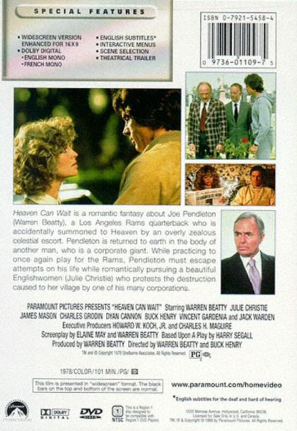 Opting for light entertainment after the critical satire of Shampoo (1975), producer-director-writer-star Warren Beatty remade the 1941 comic fantasy Here Comes Mr. Jordan. Dimly amiable L.A. Rams quarterback Joe Pendleton (Beatty) is prematurely called to Heaven by an over-eager escort (Buck Henry, who co-directed) after a traffic accident. When archangel Mr. Jordan (James Mason) discovers the error, he offers to return Joe to his body, only to find that it has been cremated. On the verge of playing in the Super Bowl, Joe demands a fit body rather than the old about-to-be-murdered industrialist Farnsworth he has been offered, but he reconsiders when he sees environmentalist Betty Logan (Julie Christie) in Farnsworth's house. Assuming Farnsworth's body while keeping his sweet self, Joe hires his beloved coach Max Corkle (Jack Warden) to get him in shape (after convincing Max who he really is), sets Farnsworth's business on an eco-friendly path, and romances Betty. Farnsworth's homicidal wife (Dyan Cannon) and secretary (Charles Grodin), however, are still determined to succeed in their plan to kill him. When Mr. Jordan finally finds the Super Bowl body Joe wanted, Joe has to trade his old self for the new life — but will he remember his love for Betty? Heaven Can Wait offered contemporary yet old-fashioned escapism and tapped into the late-1970s vogue for nostalgic fun, becoming one of 1978's most popular summer movies after Grease. Updating the original while following its blueprint, Beatty and co-writer Elaine May switched Joe's sport and turned Joe into a man of his '70s moment, adoring Betty for her convictions and favoring "green" policies over corporate greed. Gently breathing life into a classic form, Heaven Can Wait found romantic innocence in a jaded time, and it went on to receive nine Oscar nominations, including Best Picture. — Lucia Bozzola