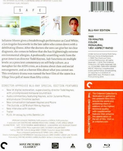 Criteron: Julianne Moore gives a breakthrough performance as Carol White, a Los Angeles housewife in the late 1980s who comes down with a debilitating illness. After the doctors she sees can give her no clear diagnosis, she comes to believe that she has frighteningly extreme environmental allergies. A profoundly unsettling work from the great American director Todd Haynes, Safe functions on multiple levels: as a prescient commentary on self-help culture, as a metaphor for the AIDS crisis, as a drama about class and social estrangement, and as a horror film about what you cannot see. This revelatory drama was named the best film of the 1990s in a Village Voice poll of more than fifty critics.