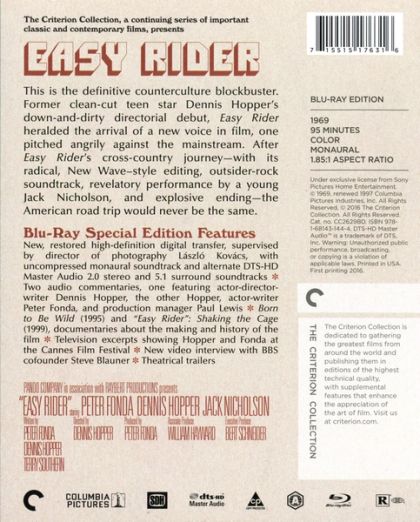Tossing wristwatches away, two bikers hit the road to find America in Dennis Hopper's anti-establishment classic. After a major cocaine sale to an L.A. connection (Phil Spector), free-wheeling potheads Billy (Hopper) and Wyatt aka Captain America (Peter Fonda, who also produced) motor eastward to party at Mardi Gras before "retiring" to Florida with the riches concealed in Wyatt's stars-and-stripes gas tank. As they ride through the Southwest, they take a hitchhiker (Luke Askew) to a struggling hippie commune before they get thrown in a small-town jail for "parading without a permit." Their cellmate, drunken ACLU lawyer George Hanson (Jack Nicholson, replacing Rip Torn), does them a "groovy" favor by getting them out of jail and then decides to join them. Babbling about Venusians, George discovers the joys of smoking grass, but an encounter with Southern rednecks soon proves how right he is about the danger posed by Billy's and Wyatt's unfettered life in a country that has lost its ideals. With the straight world closing in, Wyatt and Billy try to revel in New Orleans with some LSD and hookers (Karen Black and Toni Basil), but the acid trip is shot through with morbidity. Once they reach Florida, Billy raves about attaining the American dream; Wyatt, however, knows the truth: "We blew it." Produced and directed by two Hollywood iconoclasts with under a half-million non-studio dollars, Easy Rider shook up the languishing movie industry when it grossed over $19 million in 1969; it captured the spirit of the times as it woke Hollywood up to the power of young audiences and socially relevant movies, along with such other landmarks of the late 1960s as Bonnie and Clyde, The Graduate, and 2001. Shot on location by Laszlo Kovacs, Easy Rider eschewed old-fashioned Hollywood polish for documentary-style immediacy, and it enhanced its casual feel with improvised dialogue and realistically "stoned" acting. With a soundtrack of contemporary rock songs by Jimi Hendrix, The Band, and Steppenwolf to complete the atmosphere, Easy Rider was hailed for capturing the increasingly violent Vietnam-era split between the counterculture and the repressive Establishment. Experiencing the "shock of recognition," youth audiences embraced Easy Rider's vision of both the attractions and the limits of dropping out, proving that audience's box office power and turning Nicholson into a movie star. The momentarily-hip Academy nominated Nicholson for the Best Supporting Actor Oscar, and Fonda, Hopper and Terry Southern for their screenplay. Though none of its imitators would match its impact, Easy Rider remains one of the seminal works of late '60s Hollywood both for its trailblazing legacy and its sharply perceptive portrait of its chaotic times. — Lucia Bozzola