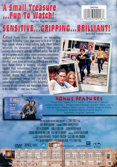 This quietly compelling film explores the hardships and anxieties of high school with intelligence, sensitivity, warmth and humor. Chris Makepeace stars as a shy, bookish student who has recently moved to Chicago and begun a new school. There he finds himself the target of a group of punks led by Matt Dillon (ideally cast as the weasel-like bully), who threaten him each day to turn over his lunch money for protection...or else. When he stands up to them, he nearly loses his dental work before being saved by Ricky Lindemann (Adam Baldwin), a hulking loner rumored to have murdered his own brother. Makepeace offers the boy a job as his bodyguard, and the two become unlikely friends — that is, until the ousted bullies find a champion of their own who challenges Lindemann. When Lindemann refuses to fight back, he disappears into reclusion, and the bullying begins anew, worse than ever. Makepeace then learns the truth about Lindemann's past: he did indeed kill his brother, but the death was an accident while the two young boys were playing with a gun, and Lindemann lives tortured by guilt as a result. Just when things seem at their worst, the bodyguard returns to face his nemesis as Makepeace and Dillon square off in the final showdown of good versus evil. The real strength of the film is its handling of the relationships between its characters, particularly between Makepeace and Baldwin, and Makepeace and his family (Martin Mull and Ruth Gordon). My Bodyguard is light but thoughtful entertainment with a Rocky theme that's suitable for the entire family. — Jeremy Beday