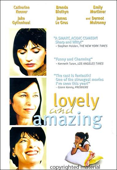 Nicole Holofcener, writer/director of the critically acclaimed Walking and Talking, shifts her focus from New York to Los Angeles for her second feature, Lovely & Amazing. Jane Marks (Brenda Blethyn of Secrets and Lies) is a middle-aged woman who's about to undergo liposuction. She has three daughters. Michelle (Catherine Keener) is a cynical, self-involved, would-be artist in an unhappy marriage. Elizabeth is a struggling actress who constantly takes in stray dogs. Her insecurities about her attractiveness come to the fore when she blows a screen test with a big movie star, Kevin (Dermot Mulroney). The youngest of the Marks sisters, Annie (Raven Goodwin), is an overweight eight-year-old African-American girl whose birth mother was an addict. Jane has adopted Annie, and is determined to provide her with a better life. Jane has a crush on her suave surgeon (Michael Nouri of Flashdance), but her family is thrown into chaos when complications arise during her outpatient procedure, and she's forced to stay in the hospital. Michelle, pressured by her husband (Clark Gregg) to take some financial responsibility for raising their young daughter, eventually gets a part-time job working in a one-hour photo booth, where she meets Jordan (Jake Gyllenhaal), a misfit teen who awkwardly flirts with her. Elizabeth's boyfriend, Paul (James LeGros), who seems to disapprove of the entertainment industry, leaves her. Annie eats compulsively and misbehaves. When the family is faced with a series of crises, relationship patterns that had solidified over the years subtly begin to change. A festival favorite, Lovely & Amazing has been shown at the 2001 Telluride Film Festival, the 2001 Toronto International Film Festival, and the 2002 Tribeca Film Festival. — Josh Ralske