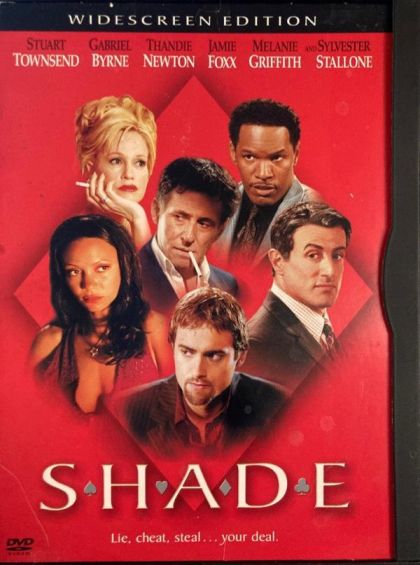 Shade, the first feature film from real-life card shark Damian Nieman, who wrote and directed the picture, stars Gabriel Byrne and Thandie Newton as a duo of con artists looking to beat the "Dean" (Sylvester Stallone), a legendary card shark, in a high-stakes poker game. Their first step is hiring two fellow tricksters — Jamie Foxx and Stuart Townsend — to provide the smooth talking and to procure the necessary funds. Unfortunately, Larry (Foxx) blows his hand and finds himself with 85,000 dollars worth of debt owed to a local crime boss. Shade premiered at the 2003 CineVegas film festival and also features Dina Merrill and Melanie Griffith. — Tracie Cooper