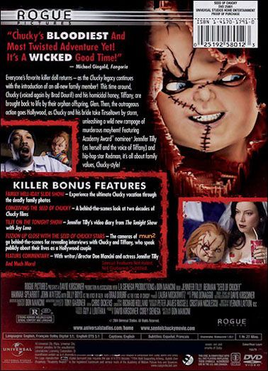 When the notoriously evil Chucky doll and his lover gave birth, they had no idea that their spawn would grow up to be a peace-loving kind of guy; however, that's exactly what Glen turns out to be: a gentle soul who is horrified at what he has been told about his family. After hearing the news of a film being made about his parents' murderous legacy, Glen sets off for Hollywood, where he promptly brings Chucky and Tiffany back to life. Far from diving into doting fatherhood, Chucky is seriously disappointed in his son's lack of inherent evil and tries his best to impart his vast knowledge of all things malevolent before Glen becomes some sort of do-gooder. Elsewhere, Tiffany finds that she will be played by Jennifer Tilly in their movie and doesn't hesitate to let her son in on their family's most cherished tradition — killing sprees. Directed by Don Mancini, Seed of Chucky features Brad Dourif returning as the voice of Chucky, while Tilly plays both herself and Tiffany. The offspring of the evil pair, Glen, is voiced by Lord of the Rings star Billy Boyd. Cult film director John Waters also makes an appearance, as does hip-hop artist Redman. — Tracie Cooper