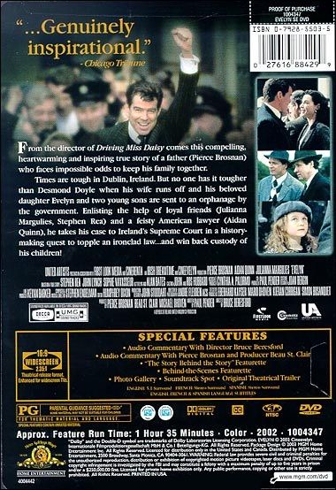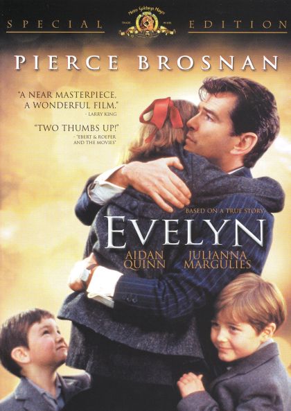One man takes on the Irish family law system and the Catholic Church in a bid to be reunited with his children in this drama, based on a true story. In 1953, Desmond Doyle ( Pierce Brosnan ) was a house painter and decorator who, despite a strong work ethic, had a hard time holding on to steady work. Desmond's wife had grown tired of her marriage and her husband's financial problems, and one day walked away from her home, leaving Desmond to raise their three children on his own. While Desmond struggles to keep body and soul together for his children, his sporadic employment eventually attracts the attention of the law, and a court order sends his two sons and young daughter to separate Catholic orphanages until Desmond can prove he's capable of properly supporting them. However, Desmond discovers merely getting work is not enough to bring his children back to him, and when he learns that his daughter, Evelyn ( Sophie Vavasseur ), is having a rough time of it at the hands of several stern nuns, he becomes determined to win their custody in a court of law. Through Bernadette ( Julianna Margulies ), a barmaid who has caught his eye, Desmond meets Michael Beattie ( Stephen Rea ), a lawyer and Bernadette's brother. While Michael doesn't believe Desmond's case can be won in an Irish court, his partner Nick Barron ( Aidan Quinn ), an expatriate American who lost custody of his own children in a divorce proceeding, is eager to help, and they agree to take the case. However, they both realize they're fighting an uphill battle, and so they persuade Thomas Connolly ( Alan Bates ), a former football star who became one of Ireland's most respected barristers, to lend his knowledge and prestige to the case. Leading man Bronson also served a co-producer for Evelyn ; Bruce Beresford directed, who previously collaborated with Pierce Brosnan on Mr. Johnson . — Mark Deming