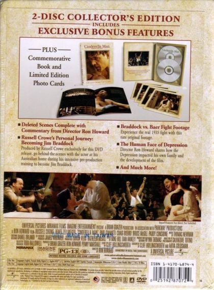 The true story of an athlete who achieved his greatest success against the most daunting odds of his life is brought to the screen in this historical drama. In the 1920s, James Braddock (Russell Crowe) from Bergen, NJ, was a promising contender in professional boxing; he had strength, spirit, and tenacity, but the combination of a serious hand injury and a 1929 defeat in a bout with light heavyweight champ Tommy Loughran sent his career into a serious tailspin. As Braddock's career in the ring dried up, the Great Depression put a stake through the heart of America's economy, and Braddock found himself working at the New York docks for pitiful wages as he tried to support his wife, Mae (Renée Zellweger), and three children. Desperate for money, Braddock turned to his former trainer and manager Joe Gould (Paul Giamatti), who was unexpectedly able to scare up a bout for him, battling John Griffin at Madison Square Garden. While conventional wisdom had it that Braddock was too old, out of shape, and out of practice to have any chance of winning, he defeated Griffin, and continued beating his opponents with a powerful left hook that had been intensified by years of punishing dock work. In a nation desperate for good news, Braddock's surprising comeback became a tonic to struggling workers and unemployed people, and all eyes were on Braddock when in 1935 he took on powerful heavyweight champion Max Baer (Craig Bierko) in what was both literally and figuratively the fight of his life. — Mark Deming