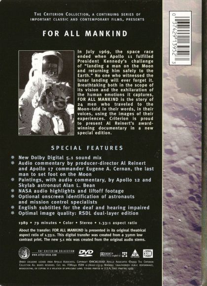 This documentary utilizes the official film footage taken by NASA and the astronauts during various Apollo missions. The footage was blown up to 35mm without a loss of visual quality. Director Al Reinert has done an excellent job of assembling a coherent documentary from all the available material. The narration includes the actual voices and words of the astronauts themselves. One reviewer called this "the most expensive film ever made," referring to the many billions of dollars that went into the moon landing program. This footage was extensively mined by Ron Howard for his (Apollo 13, so it may seem familiar. For All Mankind features a score by experimental rock composer Brian Eno. — Clarke Fountain