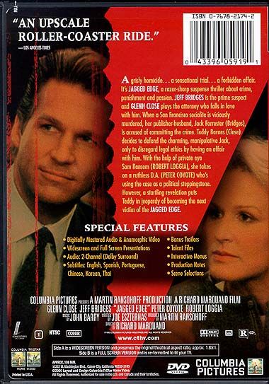 In this hit thriller, a prosecuting attorney-turned-defense lawyer falls in love with a rich, charming client who's been accused of murdering his wife and her maid with a hunting knife. When an unknown assailant gruesomely slays San Francisco newspaper heiress Paige Forrester ( Maria Mayenzet ), her husband and business partner, Jack Forrester ( Jeff Bridges ), turns to corporate attorney Teddy Barnes ( Glenn Close ) for counsel. Teddy, who quit her job with the district attorney's office four years earlier over an ethical dilemma, has reservations about returning to criminal work; nevertheless, she accepts the assignment, convinced of Jack's innocence and eager to face off in court against her old boss, DA Thomas Krasny ( Peter Coyote ), who's about run for attorney general. With the help of investigator Sam Ransom ( Robert Loggia ), the recently divorced Teddy builds a strong defense for her client, though the work — and her incipient romance with Jack — cause strain in her relationship with her children. When Jack's innocence and his romantic intentions come into question, Teddy feels her life slipping back into a moral quagmire until a series of courtroom denouements set the stage for even bigger surprises. Big-name screenwriter Joe Eszterhas ' follow-up to Flashdance , Jagged Edge was directed by Richard Marquand , who had previously lensed Return of the Jedi . Parts of Jagged Edge were shot on-location in San Francisco, whose City Hall provides the film's courtroom exteriors. — Brian J. Dillard
