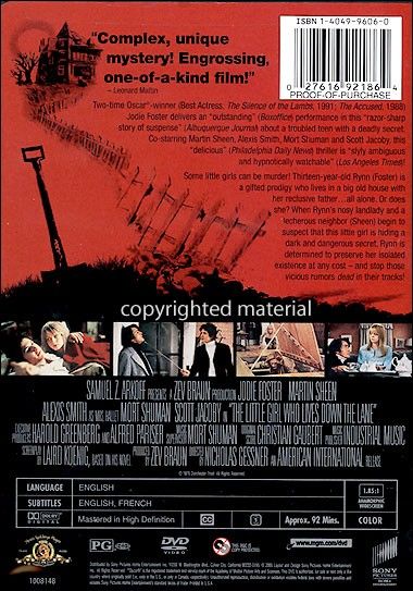 Jodie Foster plays the title character, a reclusive, fiercely self-reliant teenager who lives alone in her father's house. When visitors call, Foster explains that her father is away on business. He's away, all right. . .far, far, away. And Foster, determined not to lose her independence, will go to any lengths to protect her secret, a fact that nosy neighbor Alexis Smith learns to her regret. A new danger to Foster's well-being looms in the form of pedophile Martin Sheen, who schemes to place the girl in a compromising position. Offering a helping hand to Foster is misfit teenager (Scott Jacoby). The beauty of The Little Girl Who Lives Down the Lane is that, every time you think you've got things figured out, the filmmakers throw another spanner into the works. Based on a novel by Laird Koenig, Little Girl etc is a must-see for anyone who thinks that there's no such thing as an intelligent horror film. — Hal Erickson