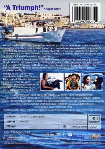 Italian director Emanuele Crialese 's Respiro tells an intimate tale of a family living in a quiet fishing community. Grazia ( Valeria Golino ) is deeply committed to her husband Pietro ( Vincenzo Amato ) and their children, as well as stray dogs. She suffers from extreme mood swings that result in serious physical attacks in times of high anxiety. Pietro decides to send her to get help, but this prompts Grazia to run away. She survives with the help of her son Pasquale ( Francesco Casisa ). Respiro was screened during Critics Week at the 2002 Cannes Film Festival . — Perry Seibert