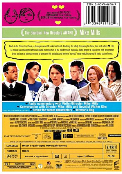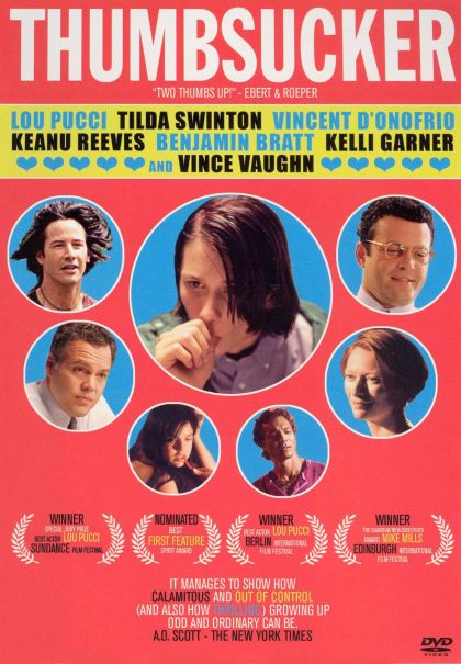 A high-school senior finds that fate (and modern medicine) plays some interesting tricks with his personality in this dramatic comedy. Justin Conn (Lou Taylor Pucci) is a neurotic teenager who has a difficult time with his peers, especially Rebecca (Kelli Garner), a cute girl in his debate class with whom he is somewhat mutually infatuated. It isn't much better at home with his obnoxious younger brother Joel (Chase Offerle), his father, Mike (Vincent D'Onofrio), who is busy having a midlife crisis, and mother Audrey (Tilda Swinton), who's infatuated with one of her favorite TV actors (Benjamin Bratt). All this anxiety has to go somewhere, and Justin's manifestation of his troubles comes in the form of sucking his thumb, which makes him even more of an outcast. Dr. Perry Lyman (Keanu Reeves), an orthodontist who seems to double as a new age therapist, treats Justin with hypnosis; meanwhile, the school psychologist decides he has Attention Deficit Disorder, and treats him with medication. Suddenly, Justin stops sucking his thumb and becomes an outgoing overachiever, single-handedly taking his school debate team to the state championship. But Justin's relationshop with his debate coach, Mr. Geary (Vince Vaughn), becomes strained, and the boy tries to mold yet another new identity for himself. Thumbsucker was the first feature film from Mike Mills, who previously distinguished himself in commercials and music videos. — Mark Deming