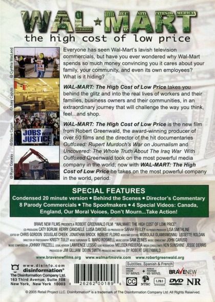 Wal-Mart has become one of America's most successful retail chains by offering everyday goods at low prices for working families. But just how is Wal-Mart able to charge less than many of their rivals, and what has their success done for their employees? Documentary filmmaker Robert Greenwald takes a look inside the discount retailer's empire in Wal-Mart: The High Cost of Low Price, and discovers a company short on scruples and long on shabby treatment of the people who work for them. Through interviews with labor experts and former Wal-Mart employees, Greenwald documents the firm's anti-union tactics, their history of paying wages often below the poverty line, the high price they charge for health benefits (employees are often encouraged to apply for government subsidized health care programs instead), their methods for driving away locally owned businesses, their practice of hiring illegal aliens for cleanup crews at a fraction of minimum wage, the abysmal working conditions and pay in the Third World plants where much of Wal-Mart's goods are manufactured, and more. Wal-Mart: The High Cost of Low Price was one in a series of activist documentaries from director Greenwald which includes the films Outfoxed: Rupert Murdoch's War on Journalism, Uncovered: The War in Iraq, and Unconstitutional: The War on Our Civil Liberties. — Mark Deming