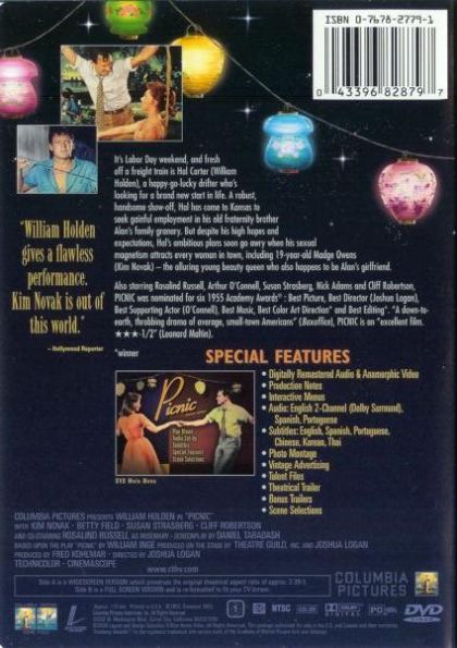 AMG Review: Based on a highly acclaimed play and awarded numerous Oscar nominations, Picnic has not aged as well as many other films from the same period. What in 1955 seemed daring and erotic now comes across as overly obvious and frightfully tame, a great deal of much ado about nothing. Worse, the film belies its stage origins, always feeling like a play instead of a movie, despite logical attempts to open it up. Speeches which had a significant impact onstage come across as mannered and artificial, and director Joshua Logan has a difficult time setting up shots and sequences involving more than two or three characters. Still, there's an undercurrent of deeper meaning underneath the surface that still manages to make its presence felt in a powerful way, and the famous dance segment still packs a punch. Although too old for the part, William Holden conveys the hidden desperation and fear of his character well and has the right physical presence the role requires. Kim Novak gives one of her better performances; the somewhat disconnected feeling she brings to her roles works well for a young girl who is disconnected from her surroundings and her future. Many may feel that Rosalind Russell goes too far over the top, but it's a brave attempt that mostly works and that creates some touching and deeply painful moments. As her love interest, Arthur O'Connell has a quite strength that plays very nicely off of Russell. Picnic also benefits from its rich cinematography, capturing the golden tones of a summer day with beauty and precision, and from its sinuous score. Logan would direct the film version of another Inge play, Bus Stop, the following year. — Craig Butler