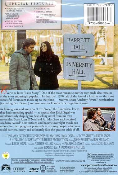 In director Arthur Hiller's surprise-hit weepie — based on Erich Segal's novella — Ryan O'Neal plays Oliver Barratt IV, a comfortably-off Harvard pre-law student who falls in love with Radcliffe music student Jenny Cavilleri (Ali MacGraw), a freewheeling, delightfully profane product of a blue-collar Italian/American family. Oliver's father (Ray Milland) heartily disapproves of the subsequent marriage and cuts off his son's allowance. Despite financial travails (the pampered Oliver actually has to go to work!), the couple is blissfully happy....until Jenny is diagnosed as having one a diseases that consigns the victim to an early death, but which leaves said victim looking like a million bucks even on the brink of Eternity. The movie's catchphrase "Love means never having to say you're sorry" became the stuff of parody as Love Story went on to gross more money than any Paramount production before it. This enormously successful film inspired an execrable sequel, Oliver's Story.