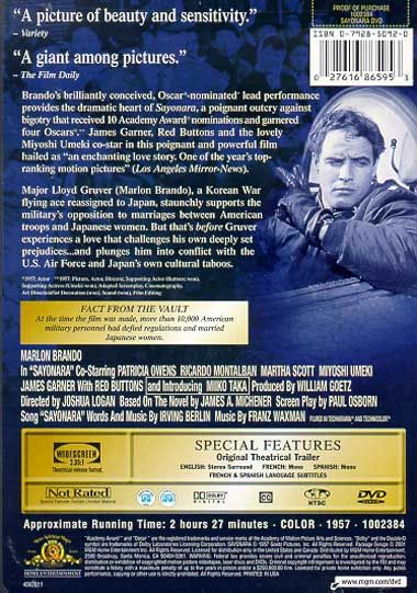 Sayonara takes its own sweet time to unfold; in so doing, it permits us to make intimate acquaintance with its characters, so as to better understand their multitextured motivations. The film is set in Japan during the Korean War. While on leave, pugnacious American soldier Red Buttons falls in love with Japanese maiden Miyoshi Umeki. Given the army's official policy against interracial marriage, Buttons is courting a court-martial. His best friend, major Marlon Brando, tries to talk Buttons out of "ruining" his life. Brando himself is about to marry Patricia Owens, the daughter of general Kent Smith. Fighting back his own prejudices, Brando agrees to be Buttons' best man at the latter's wedding to Umeki. Later, Brando himself falls for Miiko Taka, a beautiful Kabuki dancer. This sparks an all-out onslaught of racial bigotry from the Army brass, and an official edict sending American soldiers back to the states without their Japanese wives. Buttons cannot bear being parted with Umeki; as a result, the two commit suicide. The tragedy compels the army to soften its attitudes towards miscegenation. Brando is reunited with Taka, who in a parallel situation has had to ward off the inbred prejudices of her people. Nominated for ten Academy Awards, Sayonara won five, including "Best Supporting Actor" (Red Buttons, whose moribund career was revitalized herein) and "Best Supporting Actress" (Miyoshi Umeki). And yes, that is Ricardo Montalban in Japanese makeup as a Kabuki actor. ~ Hal Erickson, All Movie Guide